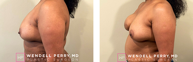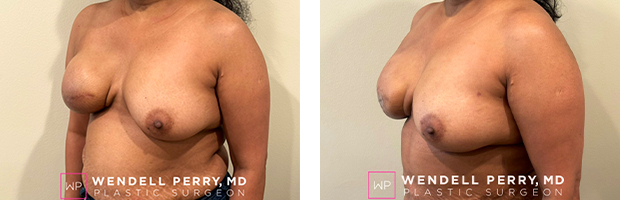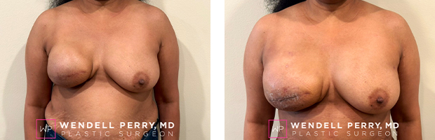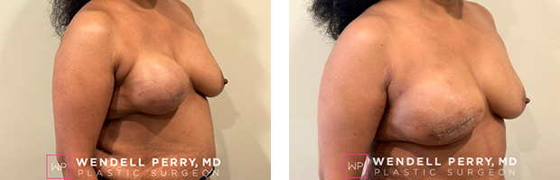This is a patient who had a right breast reconstruction who had expanders in place. The expanders were removed and permanent implants placed. Patient had fat transferred to the breast with the abdomen as a donor site. The fat transfer improves the cleavage and helps to improve the thickness covering the implant.